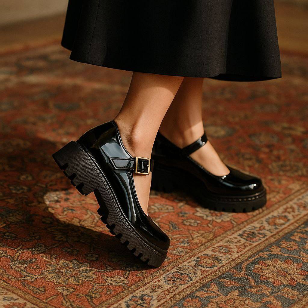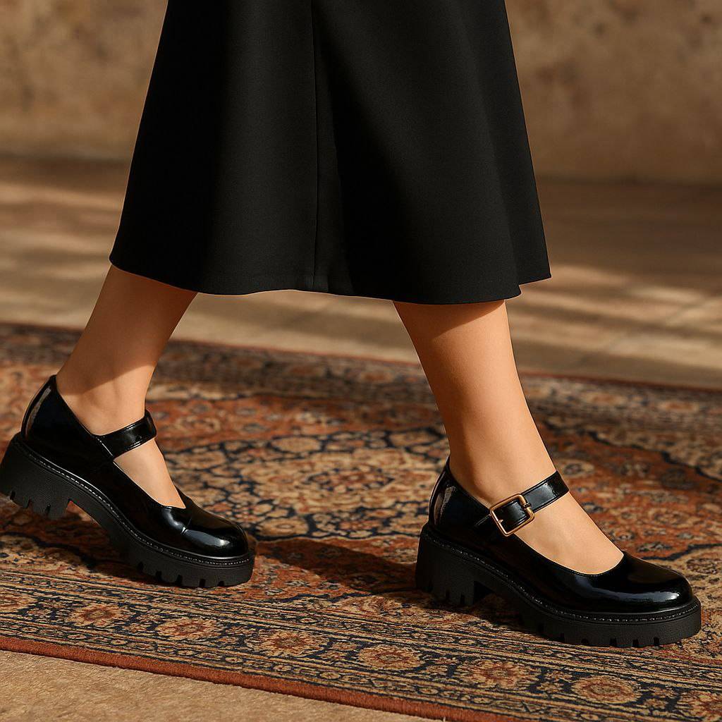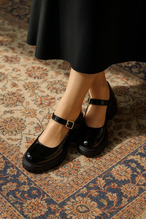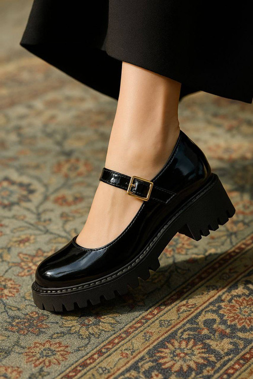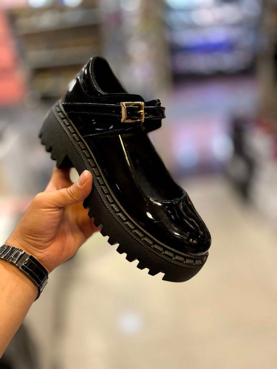 کفش ورنی مشکی با بند کلاسیک و پاشنهی محکم، ترکیب لوکس و کاربردی برای هر موقعیت."✨🤌